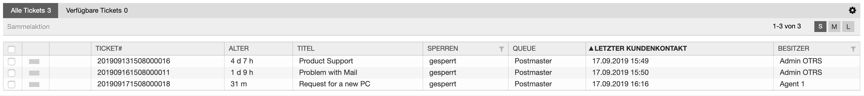 Die Sortierung nach Kundenkontakt ist in den folgenden Ticket-Ansichten für folgende Ticket-Ansichten verfügbar: