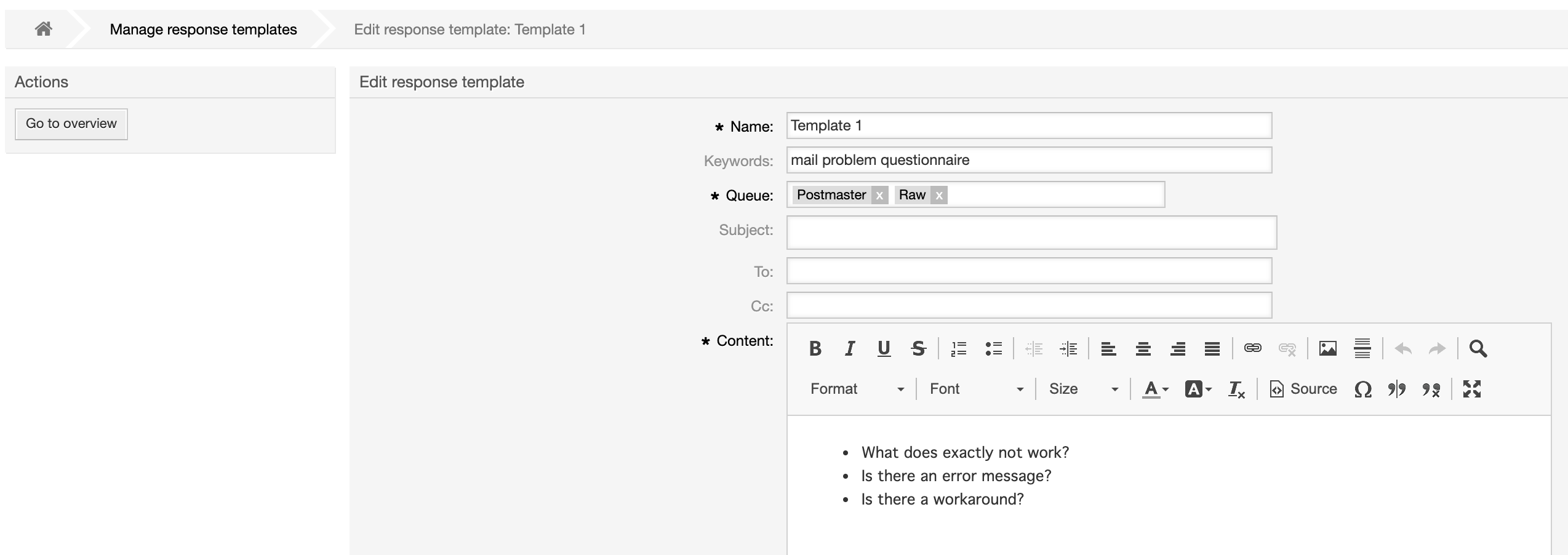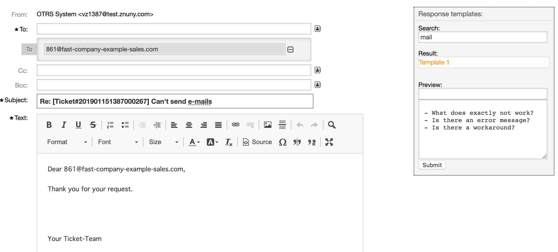 Alle bekannten OTRS-Tags können in den erweiterten Antwortvorlagen verwendet werden, und natürlich ist dieses Add-on auch in den Aktivitätsdialogen von Prozesstickets nutzbar.