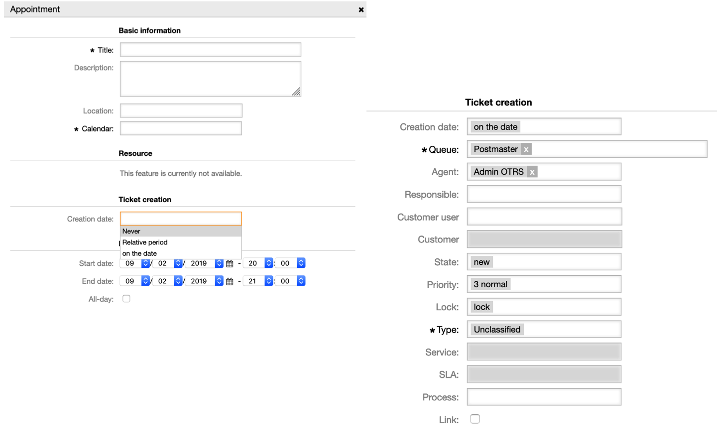 Directly in the calendar of the ((OTRS)) Community Edition we have integrated the possibility to create scheduled and recurring tickets.
