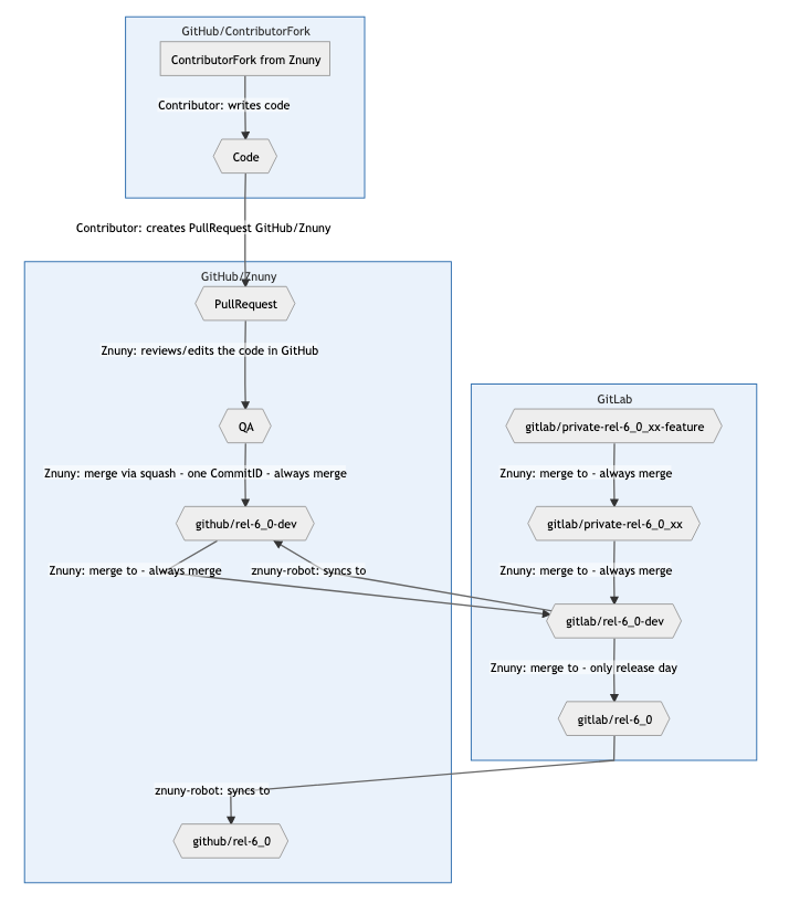 The branch rel-6_0-dev on GitHub is always in sync with our branch rel-6_0-dev in GitLab. When a release cycle is over, this branch is merged with rel-6_0 and pushed to GitHub.