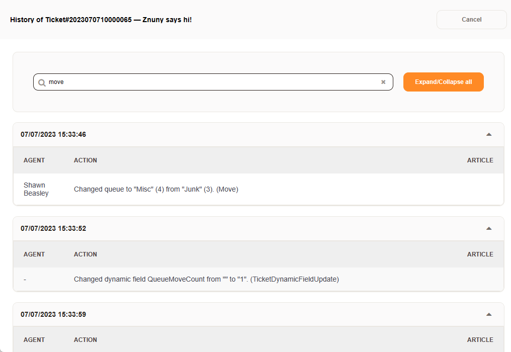 Znuny ticket history helps combat this by allowing agents to view the history of the ticket.