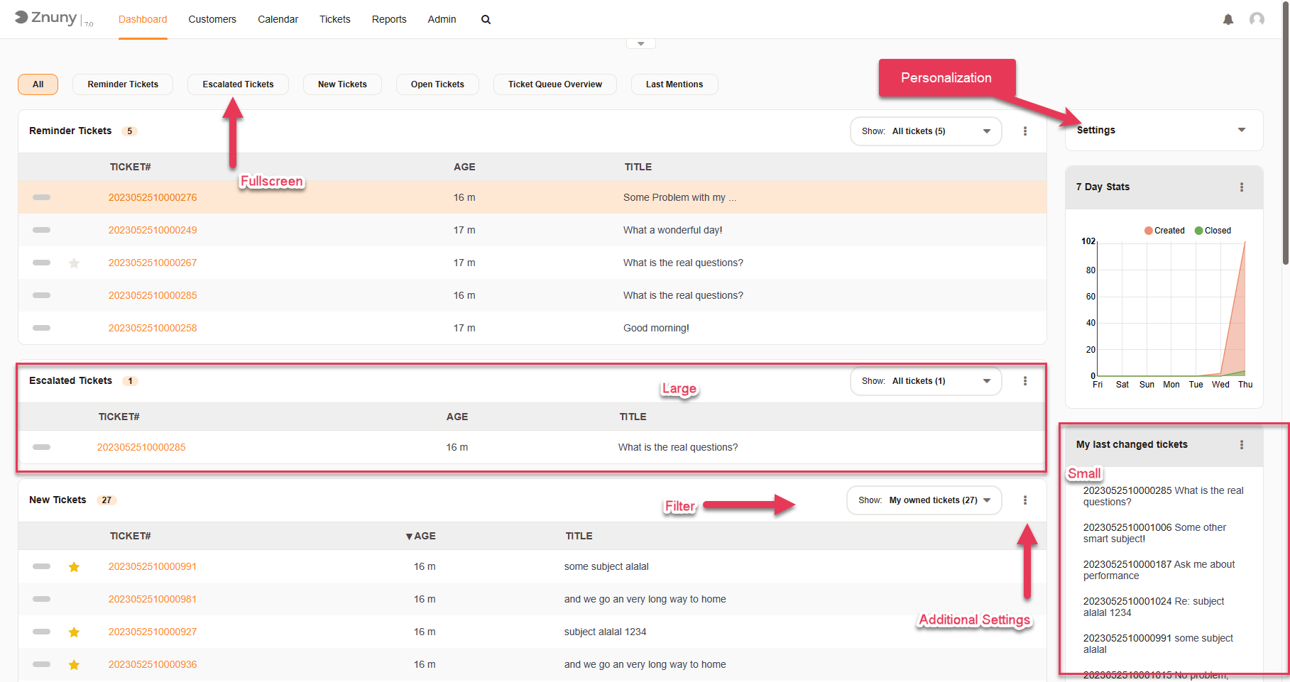 Your organization offers an overgrowing pallet of services. Customers of your organization rely increasingly on specialists who are capable and willing to manage their requests. Large international teams, mall decentralized offices and agile teams with many roles per individual: All of these require flexible, reliable and self-sufficiency. Znuny's Agent Dashboard, is the start of a well-organized day.